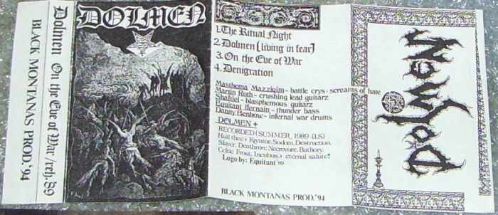 Den mest berömda i DOLMEN-familjen måste vara amerikanska DOLMEN. Mest kända som pre-ABSU. I likhet med tidiga ABSU är detta inte alls speciellt spännande. Småputtrig svartmetall uppblandat med trist thrash är vad som bjuds på demokassetten ”On the eve of war” från 1994. Jag brydde mig lika mycket om den som jag brydde mig om ABSU fram till ”The third storm of Cythraul”. Inte alls. Låttiteln ”Dolmen (living in fear)” ger emellertid starka utslag på könsrocksmätaren. Något som borde vara ett plus, men i det här fallet känns allting bara så märkligt. ABSU… ja, egentligen borde man väl ta sitt samhällsansvar och skriva en artikel om dessa dårar. Har man en frontman som spelar in knullfilm med frugan, sover med en trollstav under kudden och använder ord som ”Twilightistical” om sin egen lyrik förtjänar man ett inlägg. På tal om erotisk film. Mitt nästa mastodontprojekt blir att analysera den cineastiska varbölden ”Phallusifer – The immoral code”. För er lyckliga som inte sett den är det en rulle där bland annat Sabathan från ENTHRONED leker könsmaharadja. En black metal-porrfilm var en dålig idé från första till sista stund, däremot duger den utmärkt om man vill döda all sorts form av lust. I Bullens brevfilmer var det alltid någon stackare som fick ståfräs i skolans duschrum. Hade han sett ”Phallusifer” hade det aldrig skett.