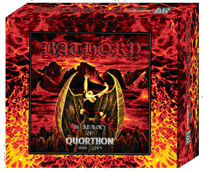 Nu när jag hetsat upp mig rejält är det dags att attackera en annan BATHORY-relaterad produkt. ”In memory of Quorthon”-boxen. Rent innehållsmässigt finns det inget direkt att anmärka på, men hade det varit så jävla mycket begärt att få den utan det Invaison-röda pixelkaoset? De måste ju fått en testpress och alla som inte har regnbågsstarr kan ju se att fodralet ser ut som skit, speciellt baksidan. Inte ens nyss nämnda och i dessa skrifter ständigt aktuella Invasion Records hade misslyckats så kapitalt. Extra märkligt blir det att själva pappfodralet känns som att hålla i ett tomt flingpaket. Billigt. Trä, metall, läder, sten eller uran hade varit att föredra. Nu snackar jag om CD-varianten, har faktiskt inte sett LP-versionen med egna ögon och jag hoppas att den blev bättre. Necrolord måste för övrigt ha varit duktig packad när han målade omslagsbilden. Den stretchande muskelbyggarängeln har två högerhänder. Bra gjort.