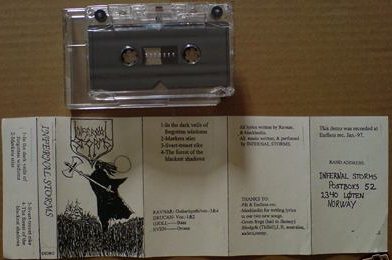 infernal stormsOm man vill dra till med en gränsryttare fanns det ju faktiskt ett norskt band som hette INFERNAL STORMS. De släppte en demo 1997 och sedan inget mer. Med tanke på hur demokassetten ser ut var det nog lika bra. Dock blir jag olustigt nyfiken på att få höra skiten och om någon i läsekretsen nu mot all rimlig förmodan äger denna får ni hemskt gärna hojta till i kommentarsfältet. Det lite VITHATTEN-minnande omslaget väcker något djuriskt inom mig.