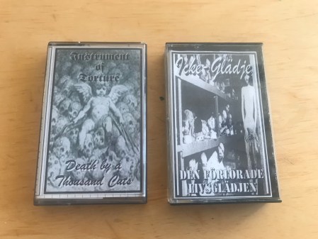 De andra två projekten som jag nämnde ovan startades nog snarare i Publisher snarare än med någon musikalisk vision. Dessa två gick under namnet Instrument of Torture och Världsbrand. Instrument of Torture-inspelningen, som jag döpte till ’Death by a Thousand Cuts’, kopierade jag faktiskt upp två kopior av, den ena har jag kvar och den andra finns i tryggt förvar hos en relativt känd black metal-sångare någonstans i Dalarna. Anledningen till att den hamnade där gissar jag var för att få höra några uppmuntrande ord av någon man såg upp till. Jag kommer fortfarande ihåg hans utlåtande, ’Det var rätt monotont’.