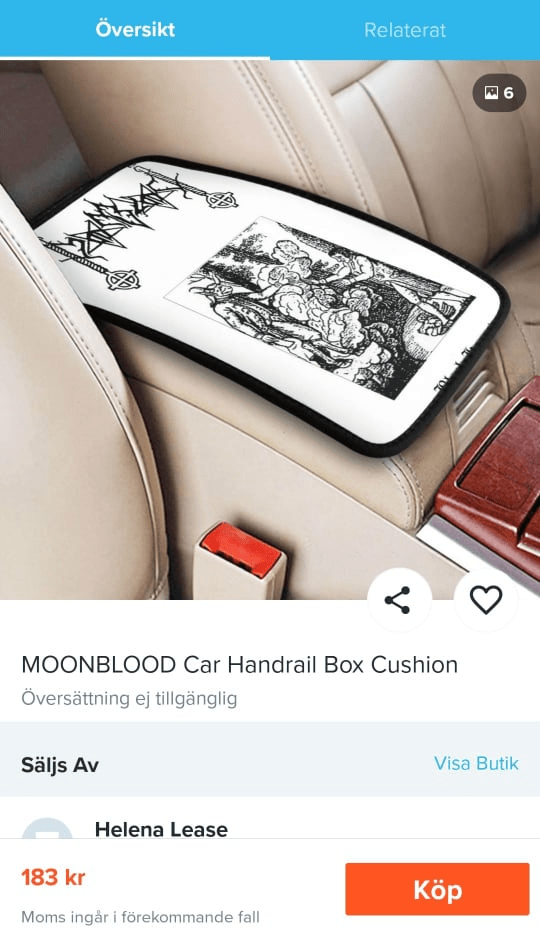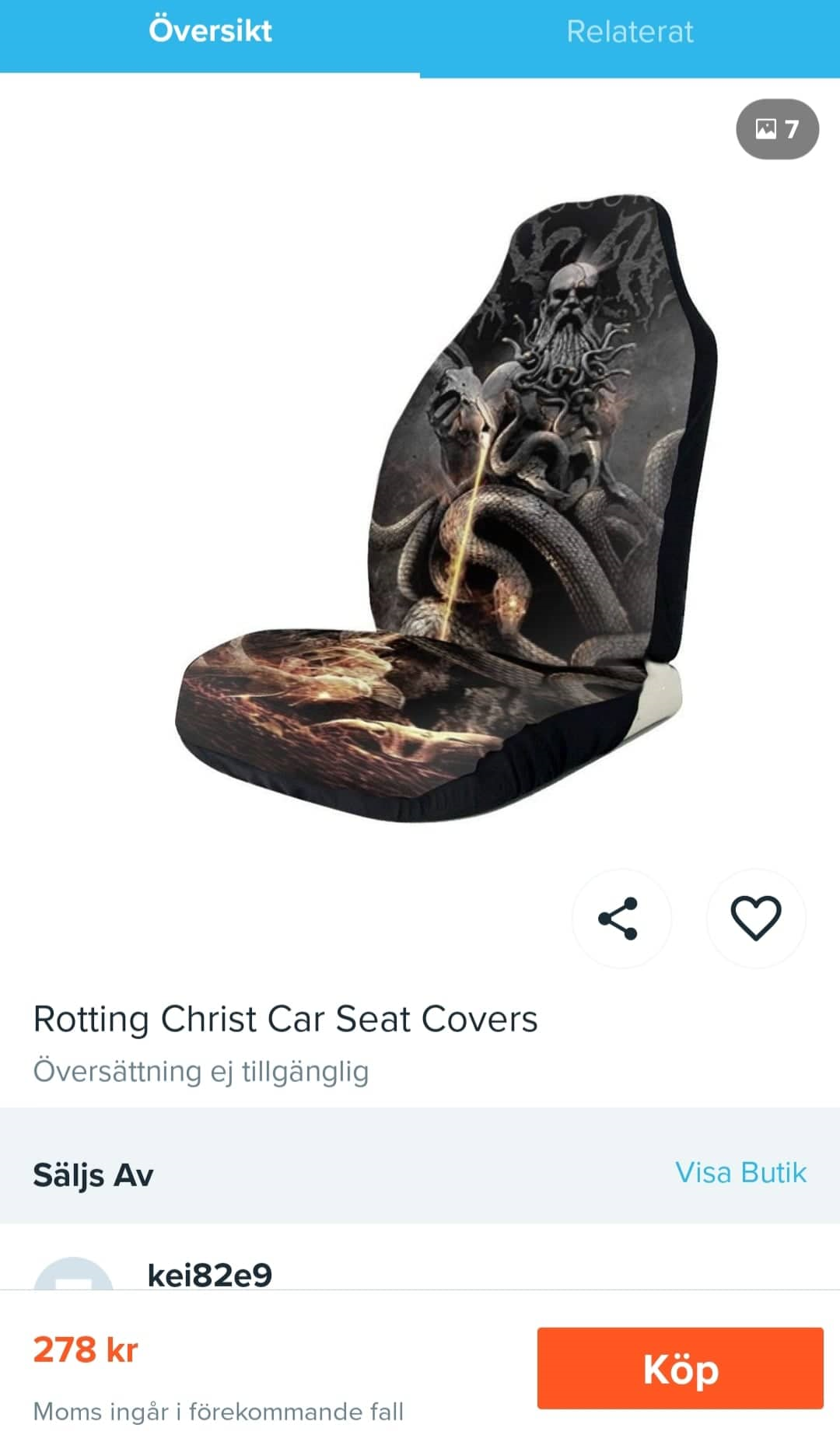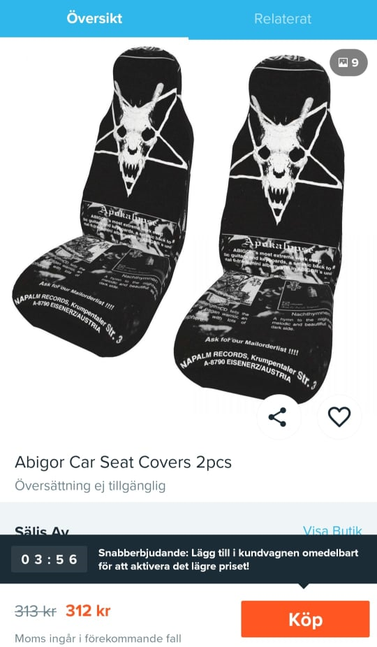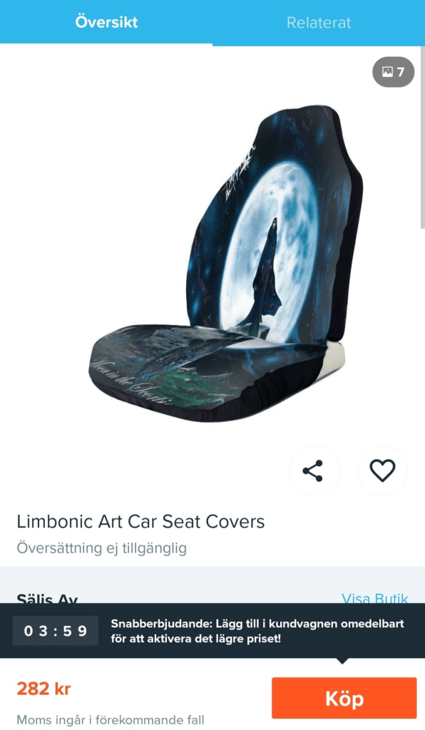 Jag trodde för en stund att det rörde sig om en Limbonic Art-bilbarnstol och det hade aldrig slutat vara roligt. Som Dr Panzram sa, bara tanken på en bilbarnstol köpt på WISH är kul. Då hatar man verkligen sin avkomma och vill se den död så snart som möjligt. I detta fall rör det sig om bilklädsel med ”Moon in the scorpio”-motiv. Undrar hur blekt den blir efter en dag och undrar hur mycket den färgar av sig.