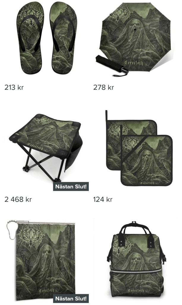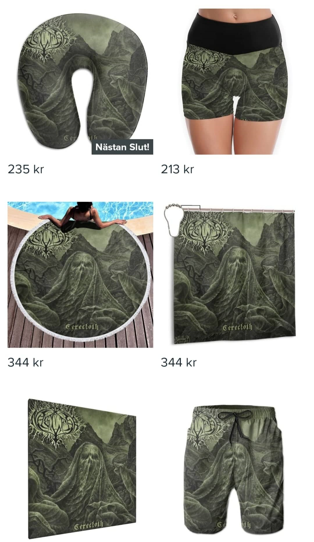 Kineserna måste ha älskat omslaget till ”Cerecloth” för jävlar i min låda vad Naglfar-produkter det fanns. Sida upp och sida ner. Tofflor, nackkuddar, filtar, mattor, kalsonger, allt. Detta är bara några exempel. Naglfar-nackkudden, jag ska ärligt säga att habegäret flammade upp.