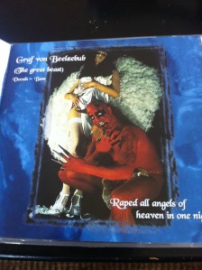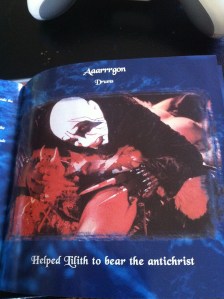 Om vi motvilligt återgår till praktfiaskot Aaarrrgon så är det alltså tänkt att han ska hålla i Liliths avkomma, hedersknyffeln vi alla lärt känna som Antikrist. Min hjärna snurrar av alla teologiska paradoxer den meningen just bjöd på. Efter en stunds djupandning i papperspåsen jag byggt av gamla NÅSTROND-flyers kan jag sansa mig och komma till en enkel konklusion: den här fotoidén suger. Ska man bygga en docka som föreställer Satan som spädbarn bör man använda andra beståndsdelar än en tvättsvamp, Falu rödfärg och Dani Filths löständer. Är det förresten bara jag som tycker att Liliths fortplantningsorgan påminner om ett rävgryt där ett tjog sjögröna kamptaxar löpt amok?