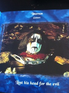 Isternos. Topp fem sämsta artistnamnen någonsin. Risigt hår som bara svartfärgat svartmetallhår kan vara. Överambitiöst 1998-liksmink. Vad björnskinnsfällen som Christer Pettersson fläkte ut kåkfararkroppen på i fibban gör i bakgrunden kan jag tyvärr inte svara på. Teorierna är många men i ett såhär tidigt skede vill jag inte dra några förhastade slutsatser. Konceptet att Isternos ”förlorade huvudet för ondskan” låter för övrigt som en grym efterhandskonstruktion skapad för att rättfärdiga deras fantastiska idé att låta hans huvud ligga på ett blankpolerat kakfat. Tänk er diskussionerna när de brainstormade fram coola upplägg för bandfoton. Åh, den som ändå fått vara en fluga på väggen så man fått höra idéerna grabbarna de facto skrotade. Typ Graf von Beelzebub utspökad i en bläckfiskhjälm med armhålorna fullproppade med trafikdödade rävar. Javisst ja, DIMMU BORGIR nöp ju den idén.