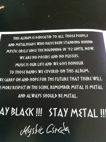 Efter denna redogörelse känner jag mig helt tom men tro inte att det här är sista gången jag kommer att skriva om MYSTIC CIRCLE. Det finns mer att hämta i det ämnet då jag knappt berört det musikaliska eller redogjort för när de försökte finta publiken genom att väva in SLAYERs ”Angel of death” i deras egna låtmaterial. Vi avslutar denna resa med följande dekret som finns för beskådning i bookleten till ”Drachenblut”.