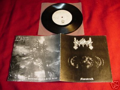 Although there are only two tracks, (one track from each artist) there seems to be alot of work put into this masterpiece. Since I do not own this release, I listened to a copy my friend had, and immediately wrote a review. I do not know the lyrics either but I believe I understand the meaning of ‘Nocturnal Silence in the Forest’. At one point, there is a lot of random screaming, which at first may sound a bit annoying, but after a few listens, the screams sound fucking amazing. I think it is supposed to resemble the screaming silence of the forest.. I’m not quite sure what that means but it sounds grim. The keyboards and synths are great as well. It doesn’t sound at all like Daemonic Alchemy, where the keyboards completely overpower the rest of the music. Every instrument blends together perfectly. This song truly lets your imagination fly to worlds unknown. When I listen to it, this is where it usually brings me: It’s a dark, stormy night, you are wandering through the thick forest and wet pine branches are making you more wet than the rain is. Lost, confused, and alone. You stop and let imagination fill your brain and take over. Now you are in a deep meditation… One with the forest… Suddenly you hear a branch snap and footseps behind you. You are being followed. You look behind your shoulder and you see a large shadowy figure slowly comming closer and closer… You see a long blade, glistening from the moonlight. It rises and is about to strike you. Frightened, you run aimlessly as fast and as far away as you can running through the branches and tripping over roots. Its so dark you can barely see where you are going. You are overwhelmed and consumed by madness. You trip again and you feel a sharp, agonising pain in you back. He caught up with you and you quickly lose a shitload of blood. Now you are dead… I assure you, this song will NEVER get boring.