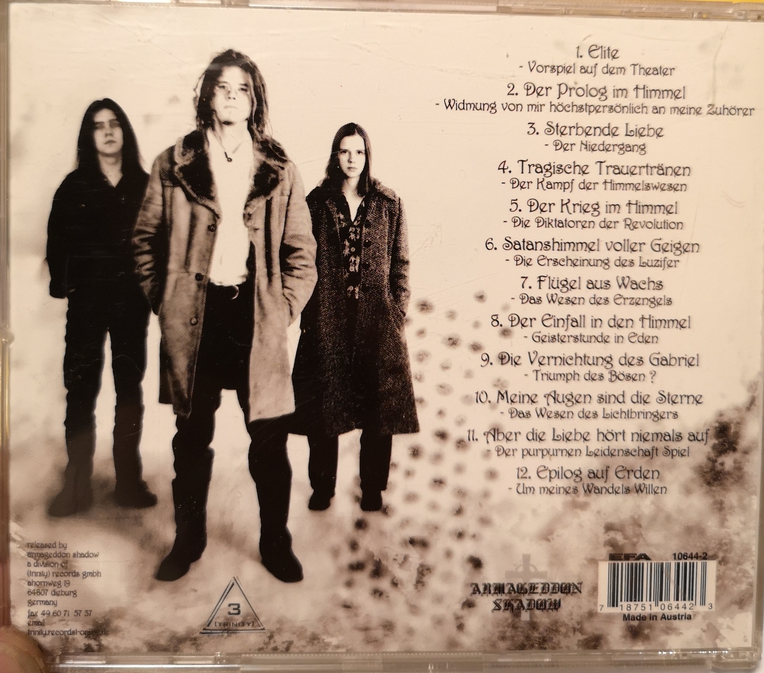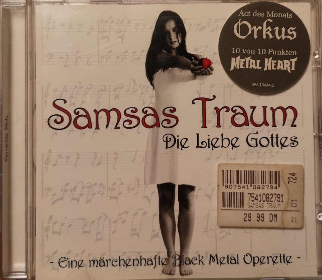 Samsas Traum, vart börjar man ens? När jag först mötte detta band hade de redan kommit längre in i en karriär som mest kantades av total tyskhet. Jag kan inte riktigt definiera det men vi vet alla precis vad det är frågan om. Det spretar åt alla håll och man undrar om GPS-signalen just försvann. Jag hade totalt avfärdat det som rent strunt. Från ingenstans får jag en dag en ingivelse att titta närmare på hur de faktiskt kan ha gjort sig ett namn som i a f jag har stött på i en massa märkliga sammanhang. Jag visste inte alls vad som väntade. Gandalf kom på besök och insisterade på att ”det här du, det är en resa du inte vill missa”. Inte nog med att man tagit namnet ifrån Kafkas Gregor Samsa utan man har även hybris nog att kalla det för en operett. Med skivan i hand så borde kanske alla brandlarm redan ha ljudit och man står tryggt på en säker plats i väntan på tröst, en raw bar och kanske en foliefilt att mildra eventuell chock med. Det är alltså handskrivna noter som bakgrund och framför står en stackars tös i bara nattlinnet och håller fram ett rött äpple…På detta har man kladdat med typsnittet från A nightmare before christmas. Det är 1999 och vi vet redan att precis allt kan hända närsomhelst. Ingen kausalitet, tabula rasa och all black metal har redan förgrenats till oigenkännlighet. Samsas Traums mastermind heter Alexander Kaschte och på baksidan av skivan står han och ser mest ut att höra hemma i en The Bomfunk MC’s -video. I tacklistan, ursäkta Danksagung, får vi även veta att Alexander tackar sin kära mor Christiane–Maria för att ha givit honom livet. Det är stark sås. Väldigt life metal men kanske tackas i a f pappa Goat of Mendez längre ner för att förstört samma liv? Icke. Istället får vi en uppräkning av Alexanders fem syskon som också anses haft en viss inverkan på Alexanders kreativitet. Pappa Rudolf, som kommer på nästa rad, har verkligen legat i och ingen är väl så glad som Alexander för det? Sedan fortsätter den vanliga tiraden av tack för skosnören och skjuts till jamboree. Det är tyska, ingen vet vad det står med eller utan universitetspoäng.